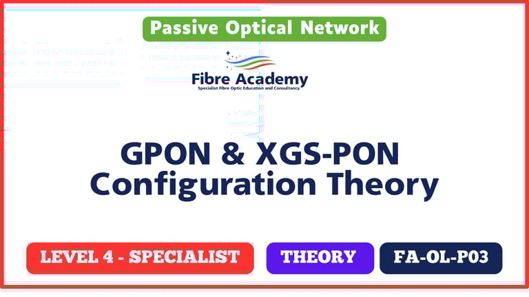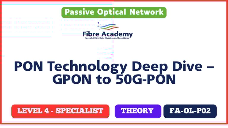 The most technically comprehensive PON course available in the UK fibre industry, this sixteen-module deep dive covers every generation of passive optical network technology from BPON and GPON through XGS-PON, NG-PON2/TWDM-PON, and the emerging 50G-PON standard. Learners master GPON frame structures, GEM encapsulation, T-CONT types, DBA, OMCI, PON security, WDM coexistence filters, power budgets, QoS, and real-world deployment scenarios. Advanced PON lab preparation modules connect theory directly to OLT configuration practice.