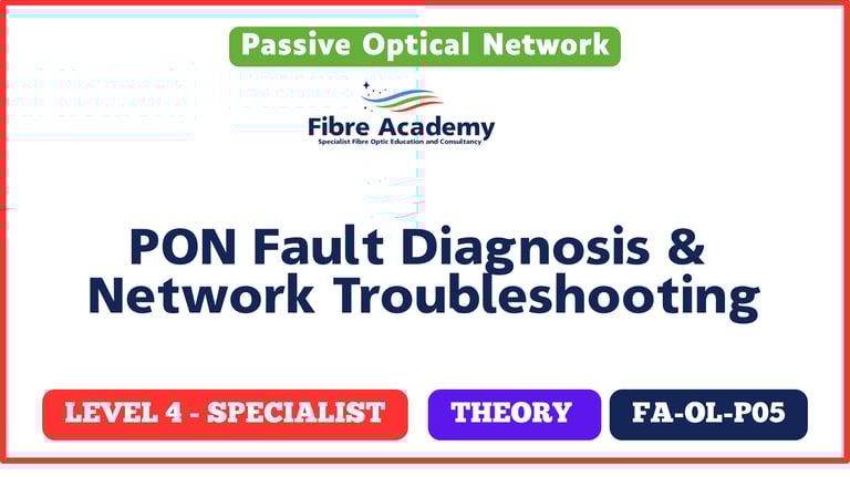 Minimise downtime and resolve faults faster with this structured advanced troubleshooting course for PON networks. Following an ITIL-informed fault management framework, twelve modules cover physical plant faults, ONU registration failures, rogue ONU detection and isolation, service-layer diagnosis (PPPoE, DHCP, VLAN), voice and IPTV faults, optical power analysis, network-wide fault events, field test tools, root cause analysis, and proactive monitoring. Complex fault scenarios and case studies develop the analytical thinking that separates expert NOC and field engineers from the rest.